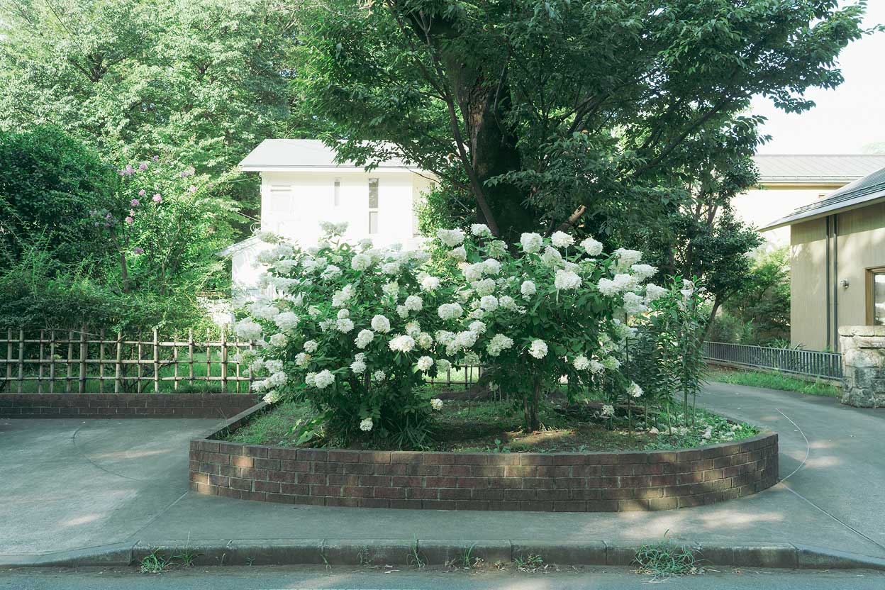 都心から電車で15分ほどとアクセスは良好。最寄駅「ひばりヶ丘」駅から徒歩10分ほど歩きすすめると、まるで避暑地のような緑深いエリアに入っていきます。色濃く豊かな緑の数々に、沿道には手入れがされた花々が並び、訪れる人たちはその姿に魅了されます。